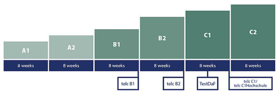 ภาษาเยอรมันมีทั้งหมด 6 ระดับ นักเรียนสามารถเรียนแต่ละระดับได้ในเวลา 8 สัปดาห์ (หรือ 2 เดือน)