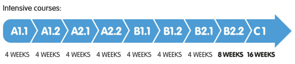 นักเรียนสามารถเรียนตามแพลนของทาง Speakeasy ได้ทันที หลังจากเรียนต่อเนื่องและเรียนครบตามแพลนนี้แล้ว นักเรียนจะมั่นใจได้ว่าจะมีทักษะและความรู้ทางภาษาเยอรมันที่เพียงพอและเทียบเท่ากับกับการเรียนในคลาสแบบปกติในเยอรมนี และสามารถสอบวัดระดับเพื่อยื่นสมัครเรียน หรือสมัครงานต่อได้